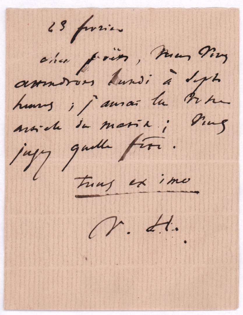 L.A.S. « V. H. », 23 février [1872], à un « cher poête » [Théodore de Banville?]| 1 page in-12. « Cher poête, Nous vous attendrons lundi à sept heures| j'aurai lu votre article du matin| vous jugez quelle fête »... [Le 20 février 1872, avait eu lieu la reprise triomphale de Ruy Blas.]
