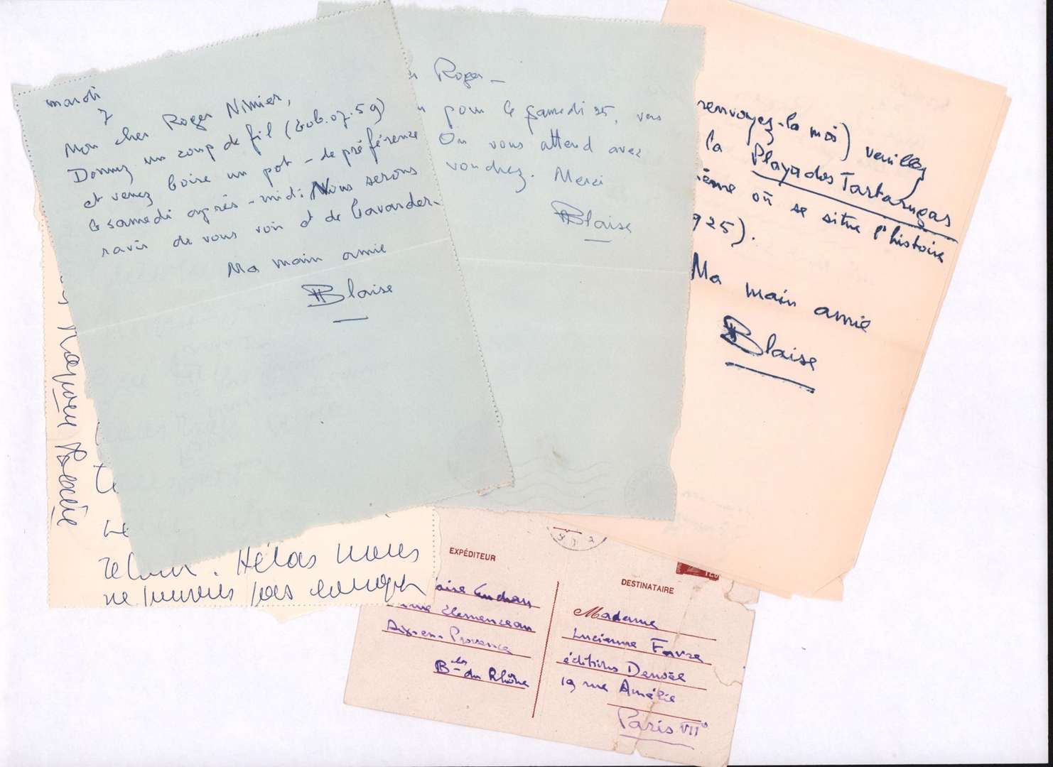 Ensemble de cinq lettres autographes la plupart signées de Blaise CENDRARS à Roger NIMIER. Formats divers enveloppes