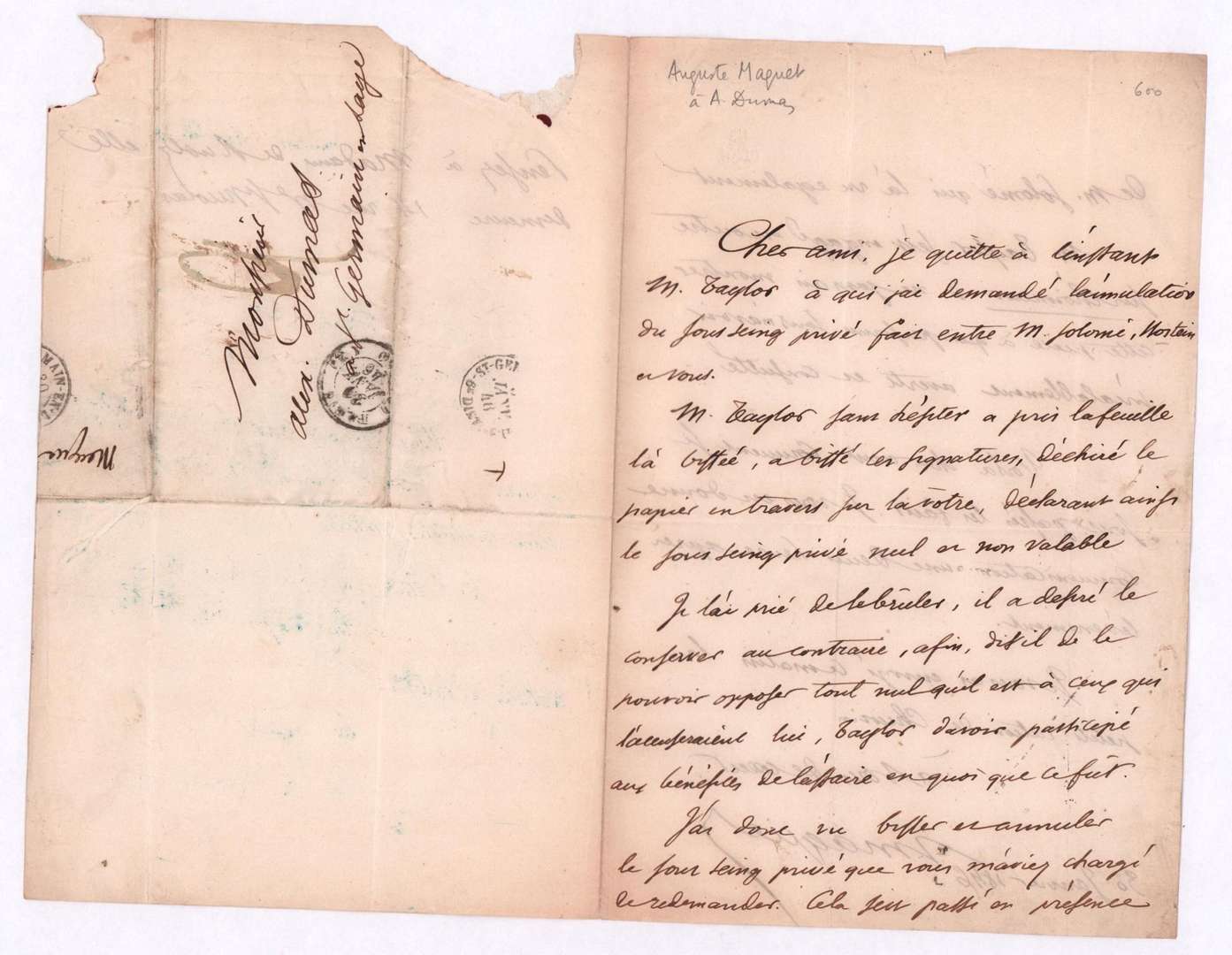 Lettre autographe signée à Alexandre Dumas (janvier 1848) lettre de celui qui écrivit de loin le plus pour Alexandre Dumas, celui qui fut sa plume.( déchirures)