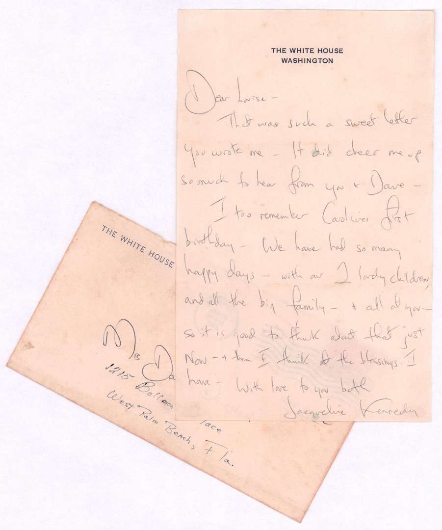 Lettre autographe signée Jacqueline KENNEDY, sur en-tête de la Maison-Blanche, à " Louise",1 page in-12,à son adresse, en anglais, enveloppe.