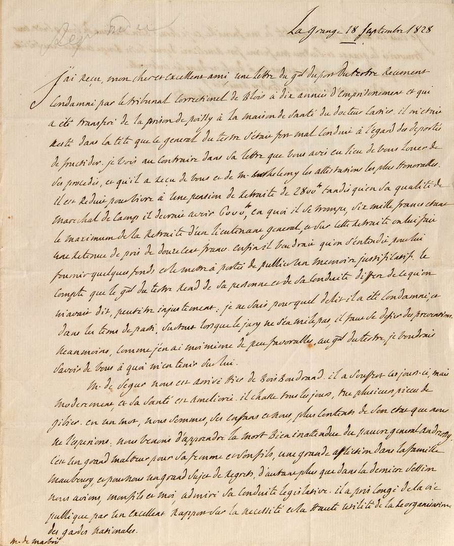 Curieuse lettre au sujet des escroqueries du général Dutertre. Après une vie agitée et de nombreuses arrestations et condamnations pour escroqueries ou trahisons diverses, Dutertre (qui se fait appeler Duport-Dutertre) a été condamné à Blois en 1825 à dix ans de prison. Transféré de la prison de Poissy à la maison de santé du docteur Cartier, il a écrit à Lafayette une supplique réclamant justice et une augmentation de sa pension de maréchal de camp... « Il m'était resté dans la tête que le général Dutertre s'était fort mal conduit à l'égard des déportés de fructidor. Je vois au contraire dans sa lettre que vous avés eu lieu de vous louer de ses procédés, et qu'il a reçu de vous et de M. Barthelemy les attestations les plus honorables ». Il est réduit pour vivre à une pension de 2800 fr et en réclame 6000, soit le maximum de la retraite d'un lieutenant général. Il réclame en outre qu'on lui fournisse quelques fonds pour « publier un mémoire justificatif . Le compte que le gal Dutertre rend de sa personne ettt de sa conduite diffère de ce qu'on m'avait dit, peut-être injustement : je ne sais pour quel délit il a été condamné », et malgré ses a priori négatifs, Lafayette veut savoir à quoi s'en tenir sur lui... Puis il donne des nouvelles de M. de Ségur qui va mieux et qui chasse toujours, et annonce avec regret la mort du général Andreossy, « d'autant plus que dans sa dernière session nous avions, mon fils et moi, admiré sa conduite législative. Il a pris congé de la vie publique par un excellent rapport sur la nécessité et la haute utilité de la réorganisation des gardes nationales »... On joint 1 P.S. par le général Dutertre, Copie des certificats des médecins en faveur du général Dutertre, 1828 | sur son transfert de la prison de Poissy à la maison de repos du Dr Cartier et les raisons de ce transfert : âge avancé, rhumatismes, asthme, diarrhée, hémorroïdes, etc.