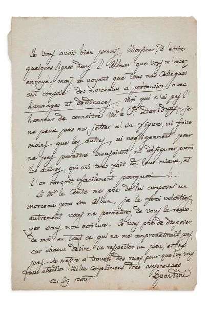 Il avait promis « d'écrire quelques lignes dans l'Album que vous m'avez envoyé, mais, en voyant que tous mes collègues ont composé des morceaux à prétention avec hommages et dédicaces, moi qui n'ai pas l'honneur de connoître Mr le Cte DEMIDOFF, je ne peux pas me jeter à sa figure, ni faire moins que les autres, ni négligemment pour ne pas paraître insouciant, ni défigurer parmi les autres qui ont tout fait de leur mieux, et l'on conçoit facilement pourquoi ! » Il n'écrira que si le comte lui demande de composer un morceau pour son album, et termine : « Je vous prie de disposer de moi en tout ce qui ne me compromettrait pas, car chacun désire se respecter un peu, et ne pas se mettre à travers des rues, pour que l'on vous fasse attention !! »