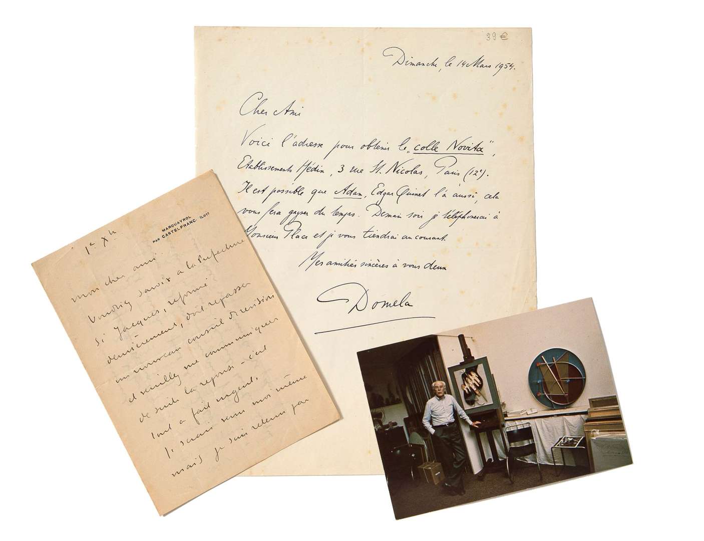 On joint une LAS de César Domela, dimanche 14 mars 1954, 1 page in-4 | une carte postale autographee signée, 1/2 page 10,4 x 15cm.