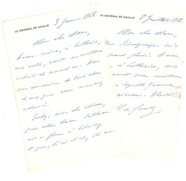 2 L.A.S. « C. de Gaulle », janvier-juillet 1968, à son cousin Marc LAMI | 2 et 1 pages in-8, à son en-tête "Le Général de Gaulle", deux enveloppes.