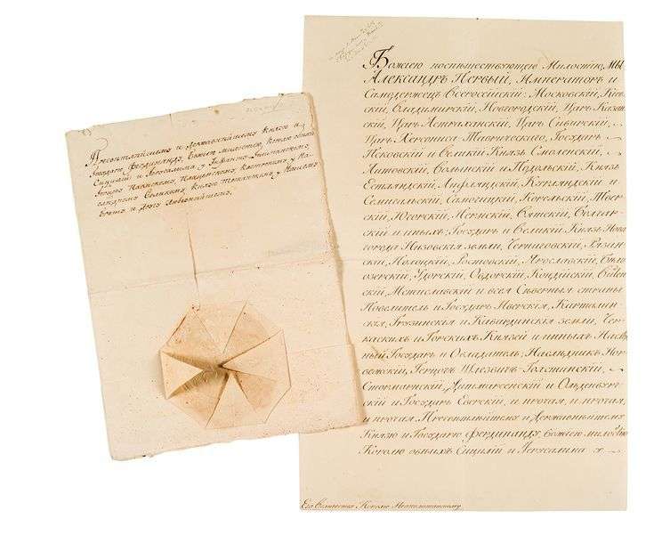 L.S. « Alexandre », Saint-Petersbourg 14 octobre 1802, à FERDINAND Ier, Roi de Naples et de Sicile | contresignée par le comte Alexandre VORONTSOV (1741-1805), ministre des Affaires étrangères | 2 pages grand in-fol., enveloppe avec grand sceau aux armes sous papier | en russe