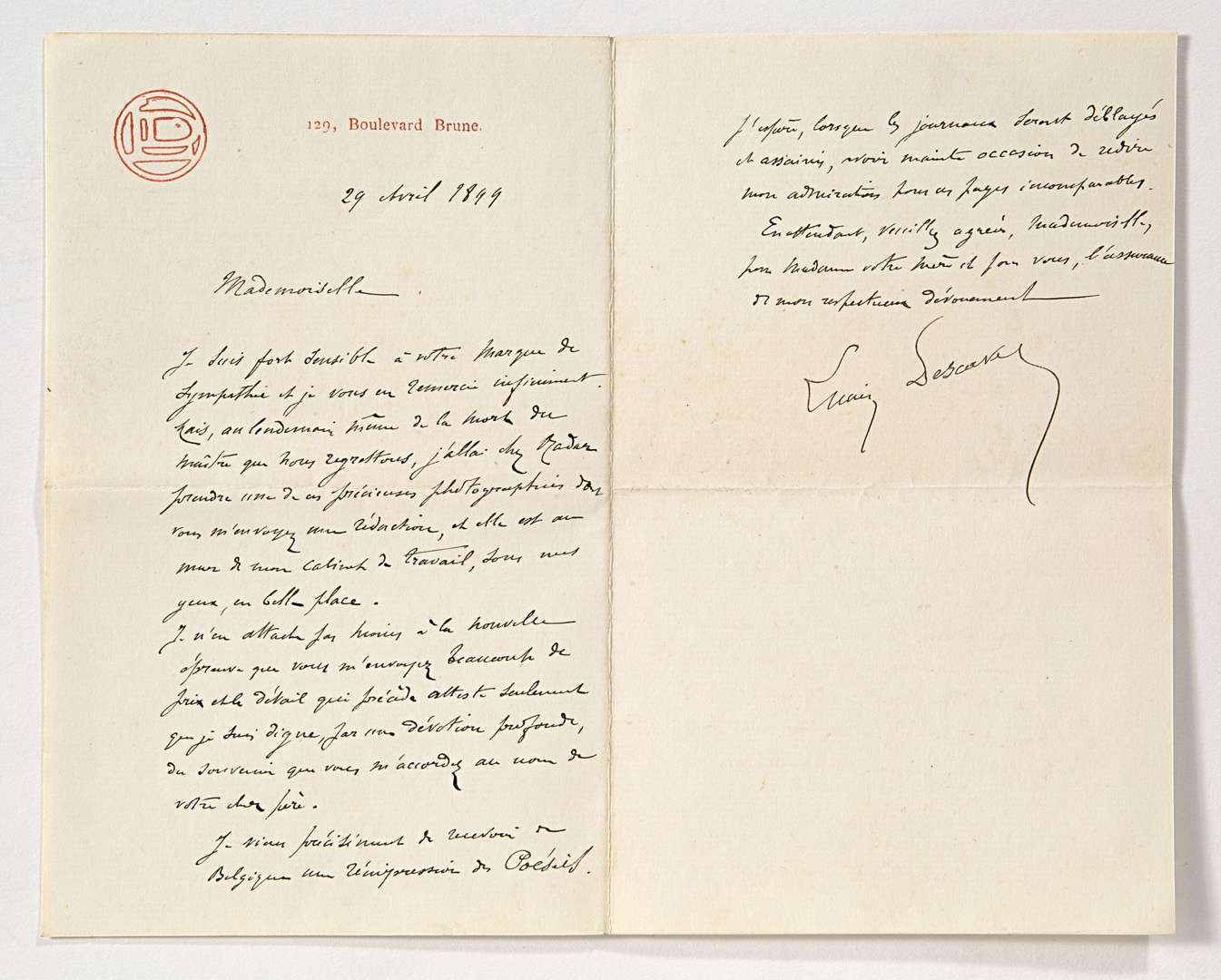 L.A.S. de Lucien Descaves, 29 avril 1899, adressée à Geneviève MALLARME, 1 page 1/2 in-12, sur papier en-tête "129, Boulevard Brune", enveloppe.