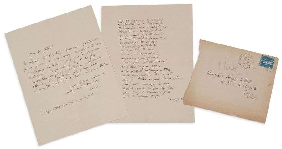 C'est en remerciement à ce portrait que Max Jacob répond en lui adressant son poème autographe : «Mon cher Delteil, en réponse à votre charmant portrait, je me permets de vous envoyer ces quarante vers, il m'arrive de faire en vers ma méditation quotidienne de pharisien. Je jette au feu méditation et poésie : faites en autant de celle-ci. Il ne faudrait pas qu'un acte d'humilité produisit l'effet contraire [...]».