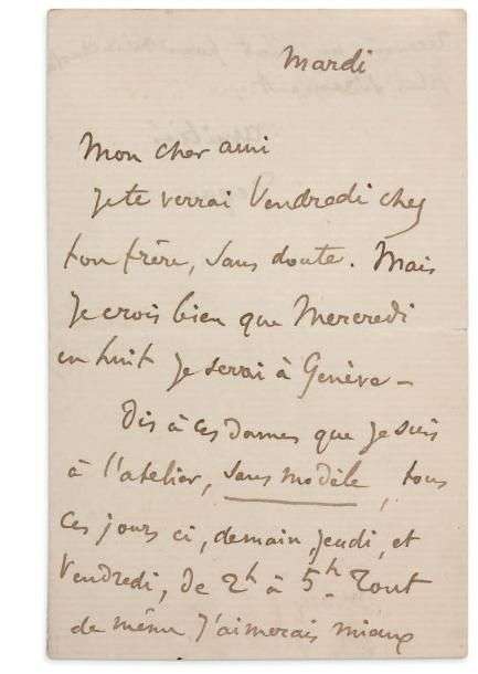 Mercredi en huit je serai à Genève. Dis à ces dames que je suis à l'atelier, sans modèle, tous ces jours ci, demain jeudi, et vendredi, de 2 h à 5 h. Tout de même j'aimerais mieux recevoir un mot pour m'incruster plus sûrement »...
