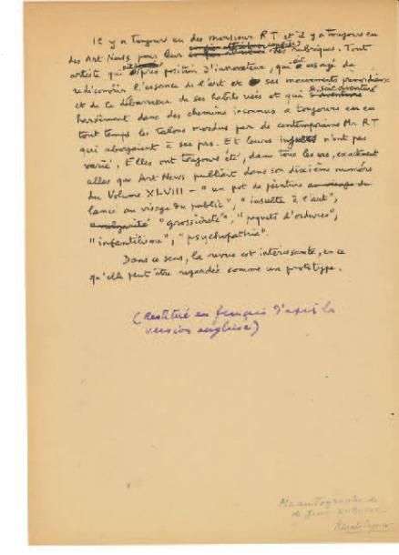 Manuscrit à l'encre avec ratures et corrections de Jean DUBUFFET relatif à l'innovation dans l'art et des publications dans Art News.