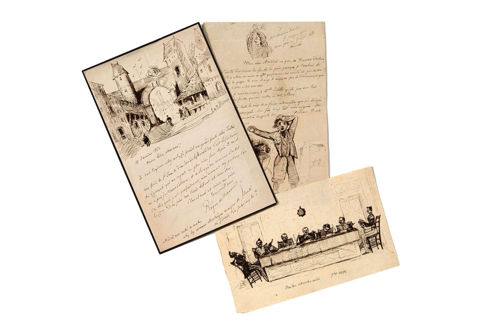 2 LAS de Roger de Beauvoir, 10 janvier 1862 et S.d., avec dessins à la plume, 1 page in-12 et 2 pages in-12.Pliures d'usures.