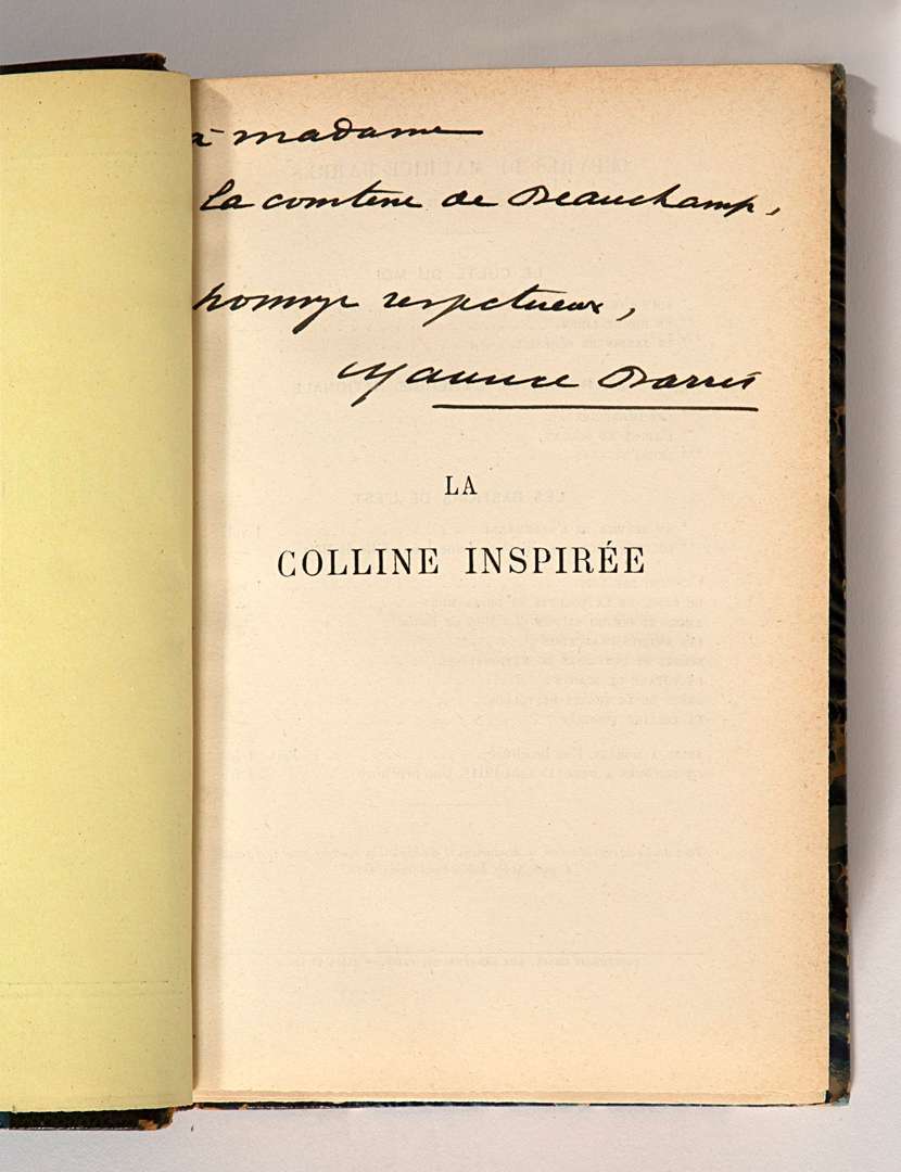 "La colline inspirée", Paris, Editions Emile-Paul Frères, 1913, ouvrage de Maurice BARRES avec envoi de l'auteur : "A Madame la comtesse de Beauchamp, hommage respectueux", in-12 relié doré sur les tranches supérieures. Usures au dos.