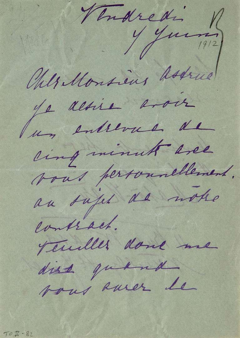 LAS de Mata Hari, Vendred 7 juin [1912], à Astruc, 2 pages 15,5 x 11,4 cm, inscription d'une adresse sous la signature : 11 Rue Windsor Neuilly Saint James._x000B_Désir d'avoir une entrevue de 5 minutes avec Astruc au sujet de leur contrat.