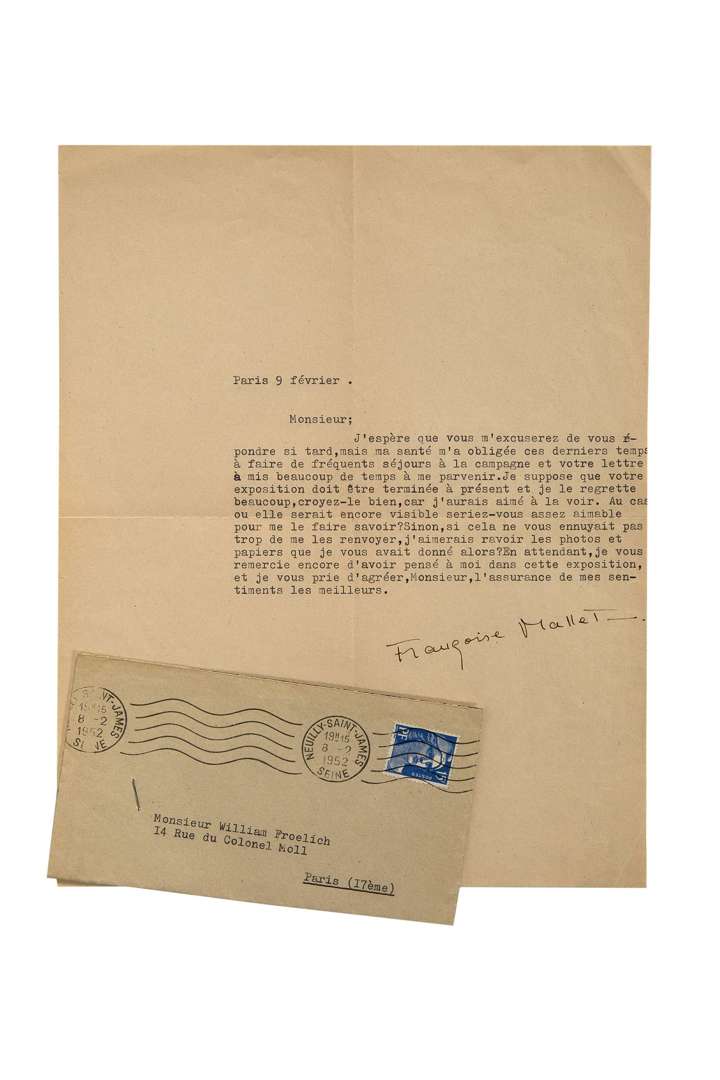 LAS de Françoise MALLET, Paris 9 février 1952, adressée à Monsieur William Froelich, 1 page in-4, enveloppe.