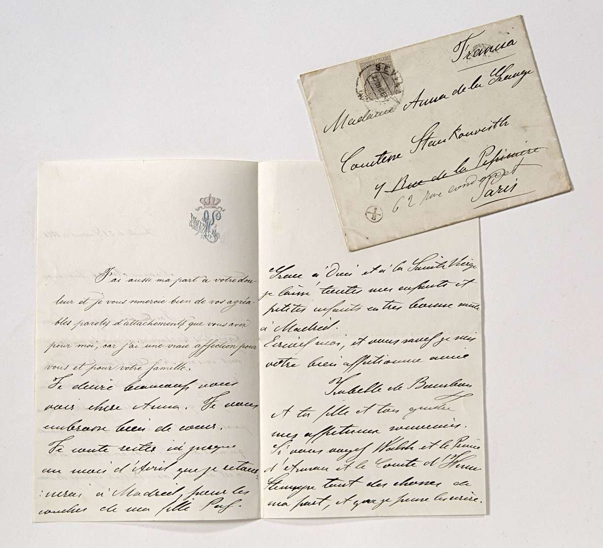 LA de Séville au 21 décembre 1883, adressée à la cantatrice Anna de Lagrange, comtesse Strankowitch, 3 pages in-8, avec papier en-tête Isabel en relief, enveloppe.