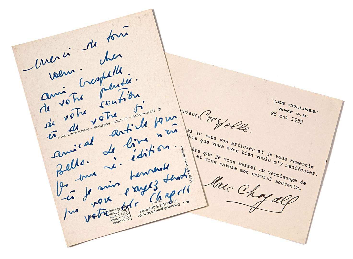 Deux cartes signées, une autographe et une dactylographiée, s.d. et 28 mai 1959, adressée à Monsieur Cresfelle, 14,8 x 10,5 - 10,8 x 14 cm.
