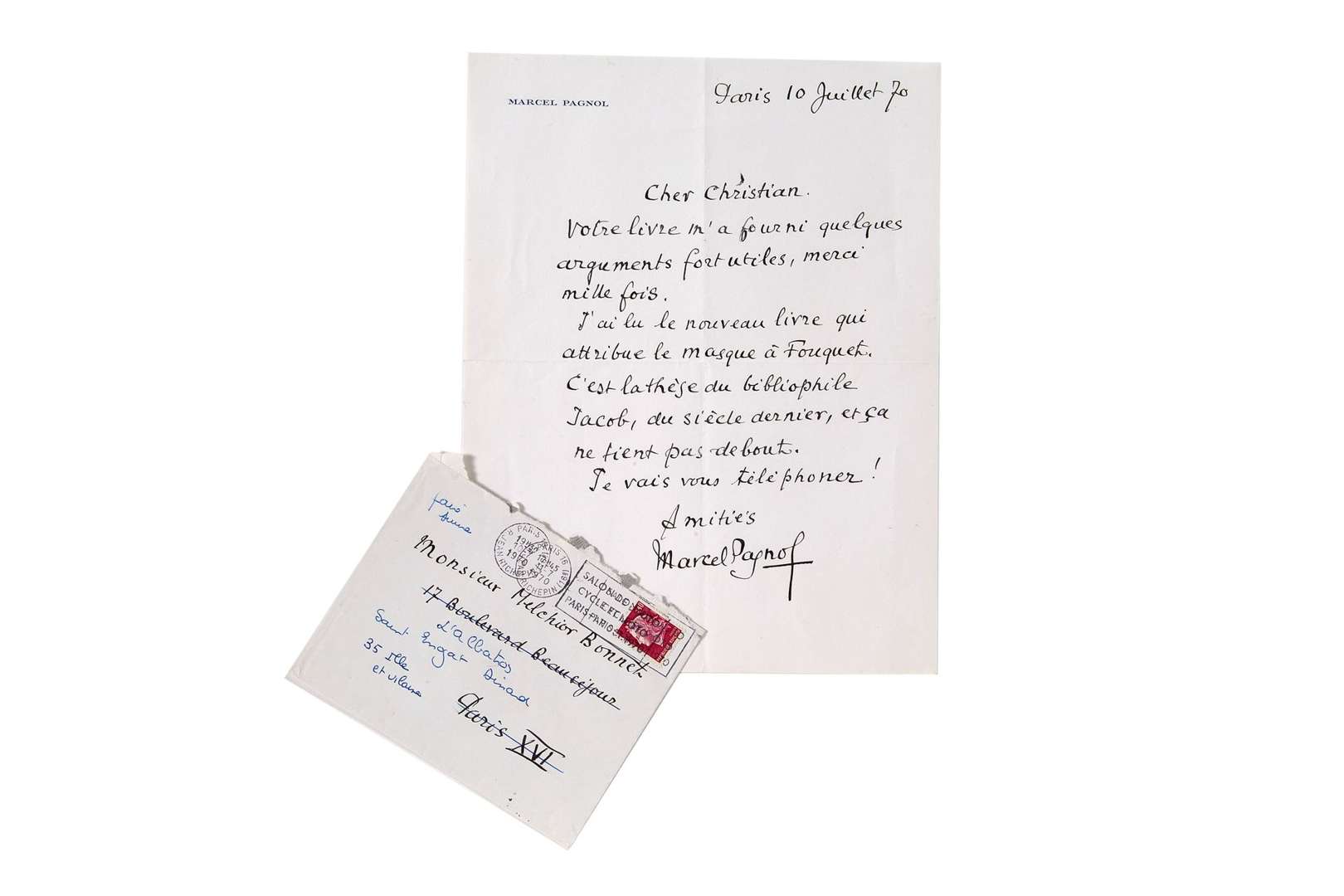 LAS signée "Marcel Pagnol", Paris 10 juillet 70, adressée à Christian MELCHIOR-BONNET, 1 page in-4, sur papier en-tête Marcel Pagnol, enveloppe.
