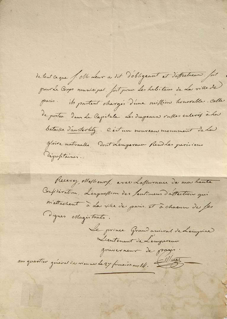 L.S signée Joachim Murat, 27 frimaire an 14, adressée au préfet de la Seine, 2 pages in-folio. Mouillures dans la partie inférieure de la lettre.