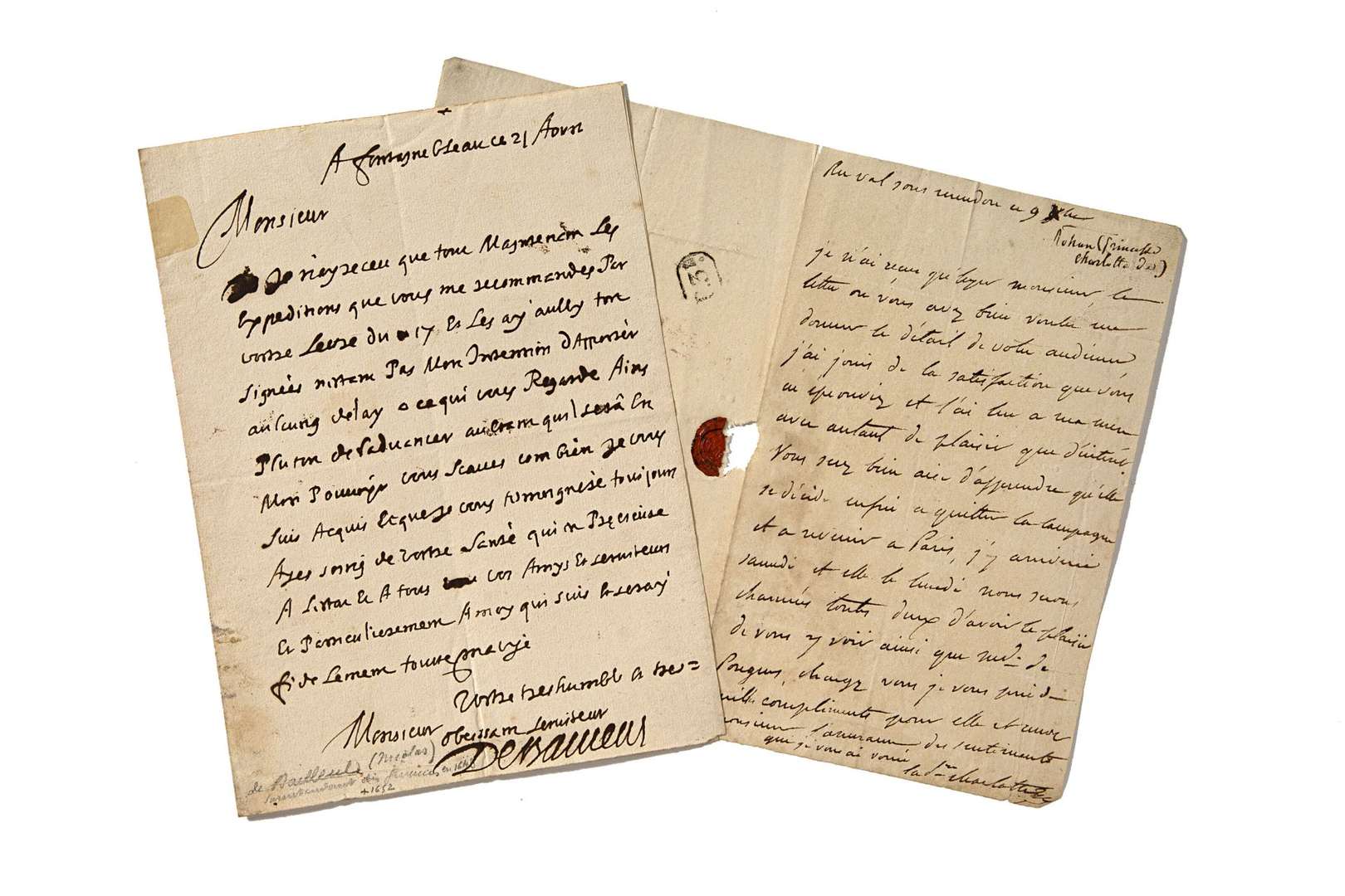 On joint une L.A.S de la princesse de Rohan-Rochefort, 1817, avec cachet de cire rouge, 1 page in-8. Manque dû au cachet..