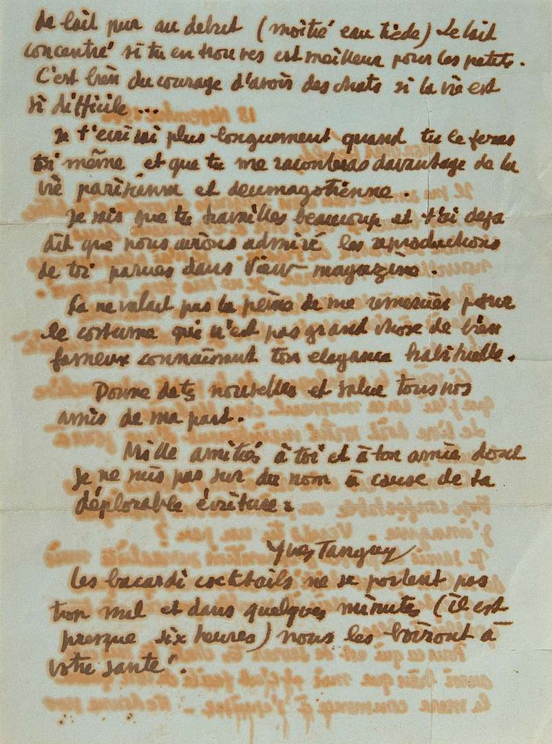 LAS signée "Yves Tanguy", 18 novembre 1946, 2 pages in-8, encre brune sur papier bleu à en-tête "Woodbury, Connecticut".Nombreuses déchirures.
