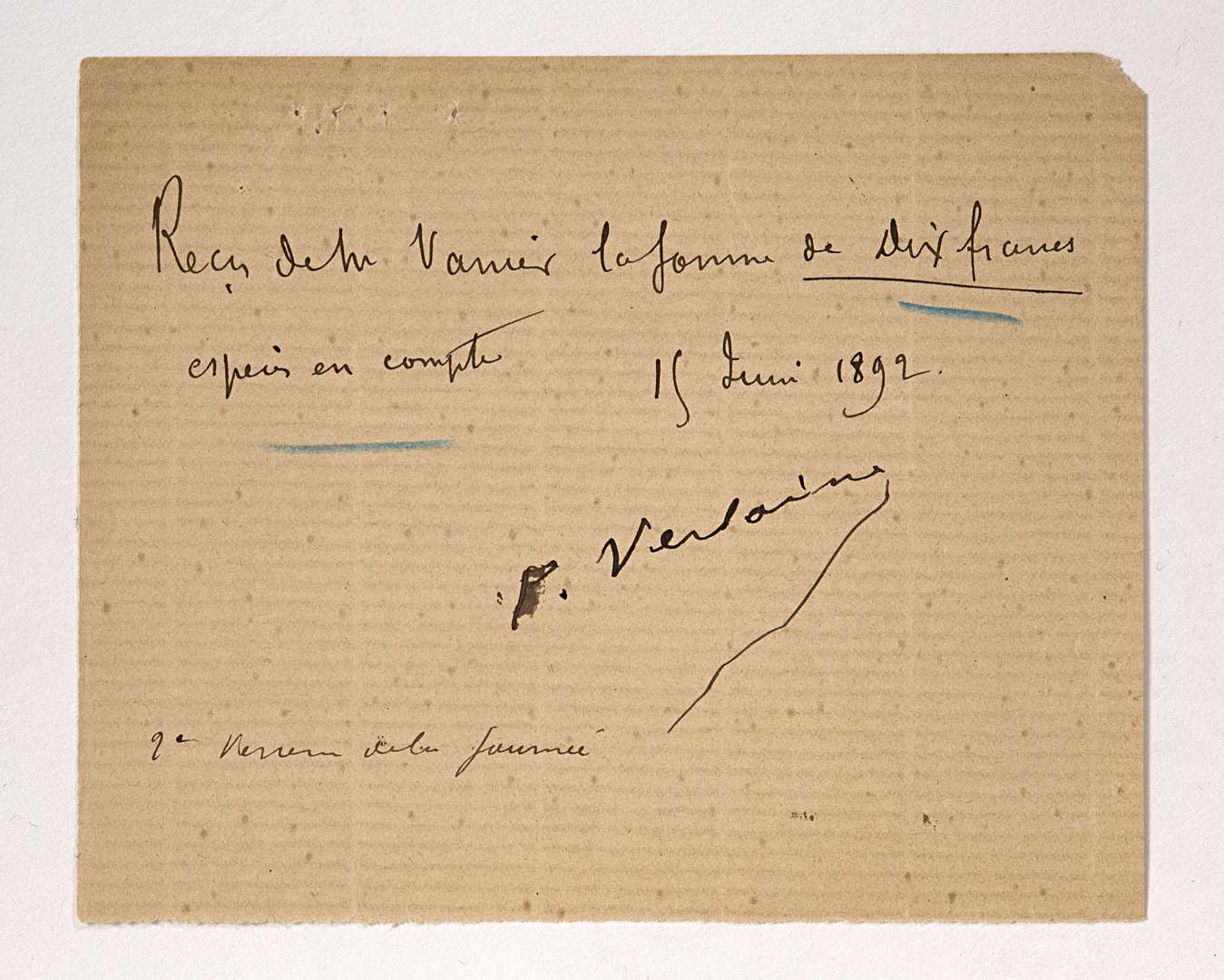 Pièce signée « P. Verlaine », S.l., 15 juin 1892. adressée à son éditeur Léon Vanier. 1 p. in-16 oblong, avec traits au crayon bleu de l'époque.