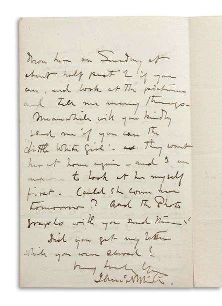 Il a reçu sa lettre ce matin seulement, car Deschamps avait oublié d’indiquer Chelsea. Il regrette de n’avoir pu assister à la soirée de samedi, et veut voir Deschamps pour avoir des nouvelles de Paris et de certaines personnes de leur connaissance. Il pourrait venir dimanche et regarder les peintures. Il le prie de lui renvoyer la Little White Girl, car les collectionneurs voudraient l’avoir à nouveau chez eux, et Whistler voudrait le voir d’abord...