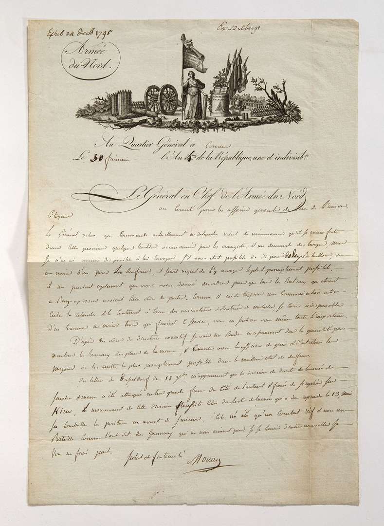LAS signé "Q.G.", Gorcum 30 frimaire IV, adressée au Comité pour les affaires générales de Terre de l'Union (Pays-Bas) 1 page in-folio, avec en-tête «Le Général en chef de l'Armée du Nord», grande et belle vignette gravée. Belle lettre sur la conquête de Hollande.