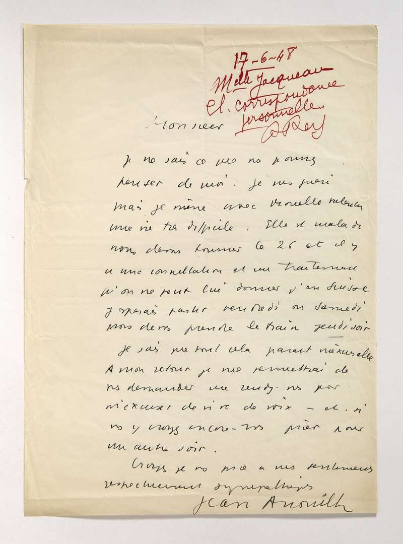 LAS signée "Jean Anouilh", 16-6-48, 4 lignes autographes signées A. Rey et datées en rouge en haut à droite, 1 page in-4.