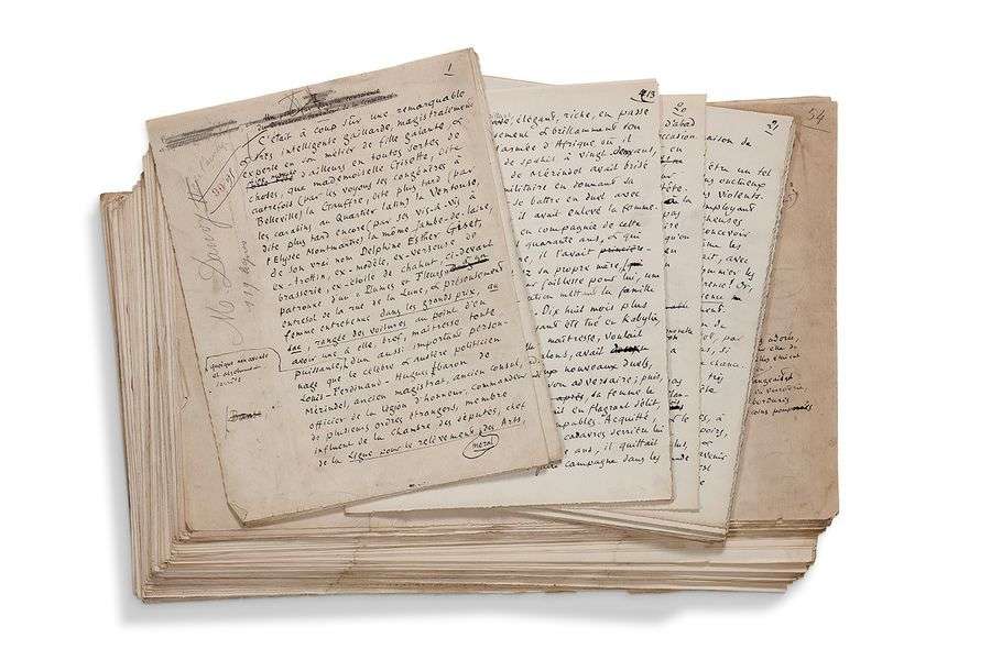 Important manuscrit rédigé pour la plus grande part sur une large colonne centrale de grands feuillets oblongs, avec d’abondantes et importantes additions marginales, ainsi que de nombreuses corrections. Ce manuscrit a servi à l'impression du livre publié en 1895 chez Charpentier et Fasquelle les nombreuses indications de typographes en sont les témoins.