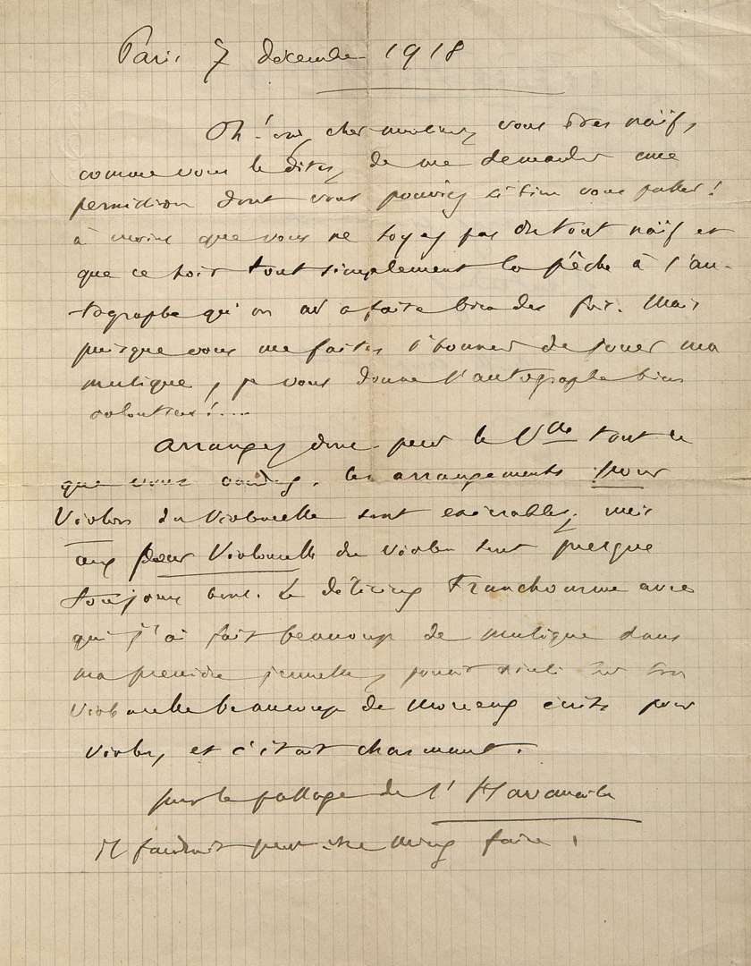 Le violoncelliste Maurice Maréchal souhaite exécuter certaines oeuvres de Saint-Saëns. Ce dernier soupçonne dans un premier temps une « pêche à l’autographe », puis se ravise : « Mais puisque vous me faites l’honneur de jouer ma musique, je vous donne l’autographe bien volontiers !... » Le compositeur l’autorise à faire des arrangements de sa musique pour le violoncelle : « Les arrangements pour violon du violoncelle sont exécrables, mais ceux pour violoncelle du violon sont presque toujours bons. » Il suggère, pour la Havanaise, deux mesures de changement possible qu’il note sur une portée de musique à la fin de la lettre. Saint-Saëns compose La Havanaise en 1887, une oeuvre concertante en mi majeur pour violon et orchestre.