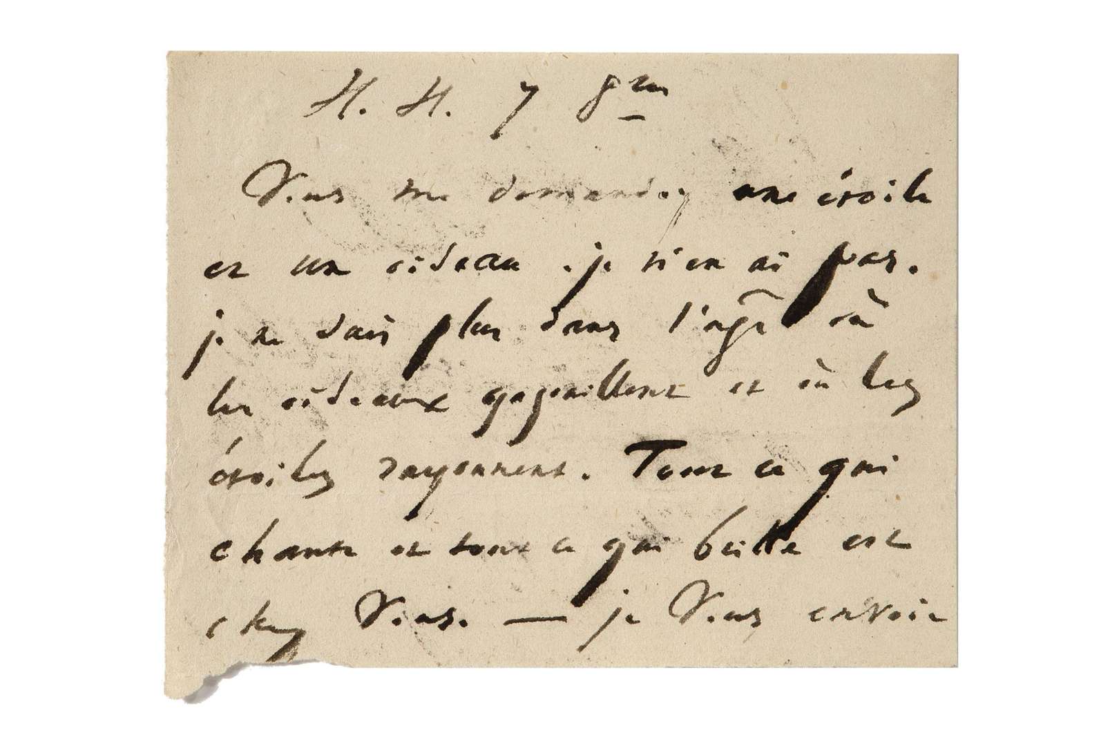 Fragment autographe situé et daté H.H. [Hauteville House] 7 octobre s.d. Une demi-page in-12 . Encre noire sur papier. "Vous me demandez une étoile et un oiseau. Je n'en ai pas. Je ne sais plus dans l'âge où les oiseaux gazouillent et où les étoiles rayonnent. Tout ce qui chante et tout ce qui brille est chez vous. Je vous envoie..."