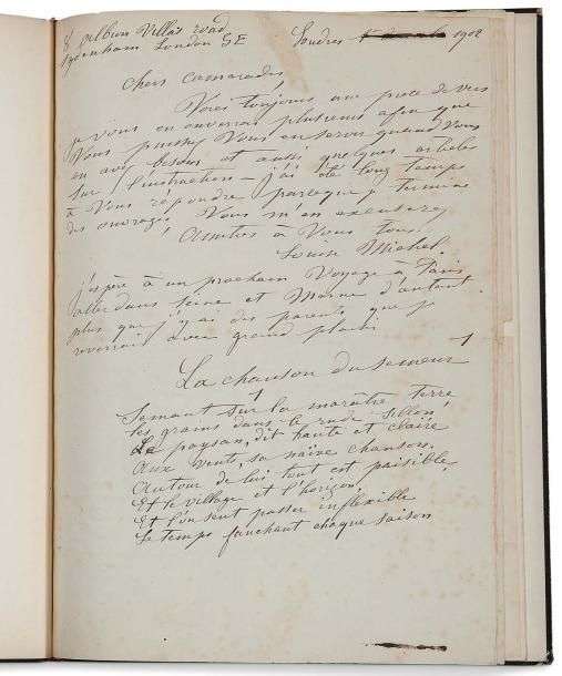 Louise Michel envoie de Londres à un cher camarade quelques poèmes dont la Chanson du semeur signé, 8 strophes de 2 pages et demi et Coupe toujours conte de Noël, 2 pages in-4.