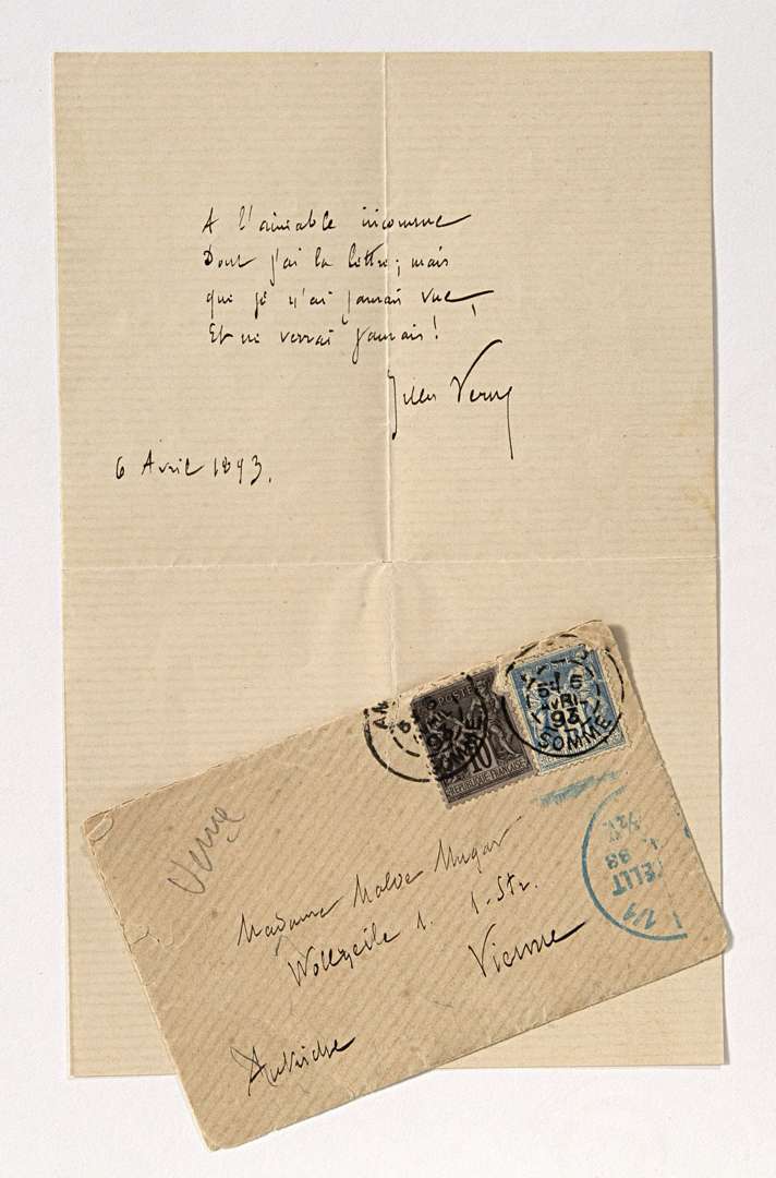 Poème signé "Jules Verne" 6 avril 1893, à " Madame Malve Mugan" Vienne Autriche - Enveloppe 1 page in-12