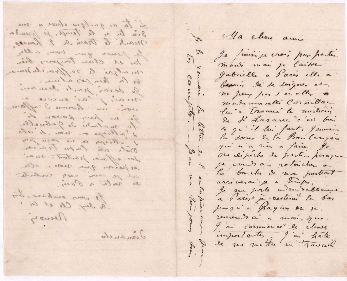 "Mon cher ami | je pense que je vais finir par partir mardi. Gabrielle reste à Paris parce qu'elle a besoin d'un traitement et ne peut pas partir. Mlle Cornillac a trouvé son médecin de Saint-Lazare. Elle avait en effet besoin de lui. J'emmène avec moi la soeur des boulangers. Elle n'a rien à faire ici. Je veux partir le plus vite possible car je voudrais retoucher la bouche de mon portrait. J'espère qu'il ne sera pas trop tard. Je m'aime bien à Paris. J'y resterai jusqu'à Pâques et je reviendrai, sauf si je suis au milieu d'un travail important. J'ai tellement hâte de commencer mon travail. Si vous avez quelque chose à me dire, vous avez encore le temps de le faire. Je prends le train de 14 heures. Je pense que vous et Clau vous en sortez bien, malgré le temps qui se refroidit. Demain, je serai parti, mais je dois encore voir cet homme d'affaires. Je ne sais pas si la maladie de Gabrielle est contagieuse. Si elle est contagieuse, les choses ne vont pas être faciles, car elle laisse traîner ses affaires pppartout. Espérons que ce ne soit pas le cas. Je pense qu'elle est très heureuse de rester à Paris. Amour pour Clo et vous Renoir Dimanche je vous envoie la lettre de l'entrepreneur, pour vos dossiers. Jean va bien."