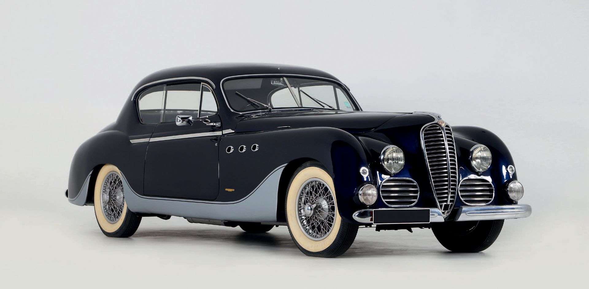 Emile Delahaye est né à Tours en 1843 et c’est à Paris en 1895 au salon du cycle qu’il présente sa première automobile. Il se lance dans la course automobile dès 1896 conduisant lui-même un break 4 places. Fort de ses succès en compétitions la marque commence à être connue, à avoir une bonne réputation et à être choisie par une clientèle aristocratique dont la duchesse d’Uzès, une des premières femmes automobilistes. La firme est installée rue du Banquier et sera, après le retrait de son fondateur, dirigée par Charles Weiffenbach surnommé «Monsieur Charles» qui recruta l’ingénieur Jean François. C’est lui qui saura lancer le nouveau Type 135 en 1933. La firme s’oriente alors vers la production de grandes routières à caractère sportif. Issu du Type 138, le Type 135 est proposé sur un nouveau châssis surbaissé avec un moteur 3,5 litres. Elle va faire parler de la marque Delahaye avec ses succès dans les compétitions et les concours d’élégance avant et après la seconde guerre mondiale. Le Type 148 sera ensuite décliné en version «Tourisme» du Type 135. Une Delahaye avait le choix de sa robe et il y avait deux écoles de carrosserie française. La traditionnelle avec Chapron, Letourneur & Marchand, Pourtout, Guilloré et l’autre qui recherchait un nouveau style avec Figoni & Falaschi, Saoutchik ou Antem. Après avoir travaillé ensemble pour Henry Binder, Jean-Marie Letourneur et Jean-Arthur Marchand fondèrent leur entreprise de carrosserie en 1905 et très vite se sont spécialisés dans la carrosserie de châssis prestigieux. Ils devinrent les carrossiers privilégiés des marques Delage, Bugatti, Talbot, Hispano Suiza et bien sûr Delahaye. Notre Delahaye est très un beau Type 148 Coach panoramique réalisé par Letourneur & Marchand en 1949. Elle fut entièrement restaurée depuis le châssis il y a quelques années et se présente dans un très bel état de présentation. C’est ainsi que la sellerie, les boiseries, la mécanique et la carrosserie furent entièrement refaites à neufs en prenant soin de respecter les caractéristiques d’origine. Sa livrée bleu soutenu, associé à un intérieur bicolore en cuir et velours est tout simplement splendide. Les moquettes et garnitures viennent ajouter à l’ensemble une certaine démesure propre aux véhicules de cette période. Equipé d’un autoradio Arel son tableau de bord gainé de cuir est complet et en bel état. Son moteur six-cylindres équipé de trois carburateurs est accouplé à la fameuse boite Cotal électromagnétique à 4 rapports que l’on manipule du doigt aisément. Extérieurement, la voiture est équipée de roues à rayons peinte avec moyeu central de style Rudge, montées de pneus à flanc blanc. Elle est équipée de tous ses ornements chromés dont un porte bagage sur la malle arrière de fabrication moderne. Le dessin panoramique de cet élégant coach est une très belle illustration de la qualité de la carrosserie française. Au Total, 2 592 Delahaye Type 135 furent produites, les survivantes étant devenues des pièces de collection particulièrement recherchées quand leurs carrosseries revêtent un intérêt particulier comme c’est le cas ici…