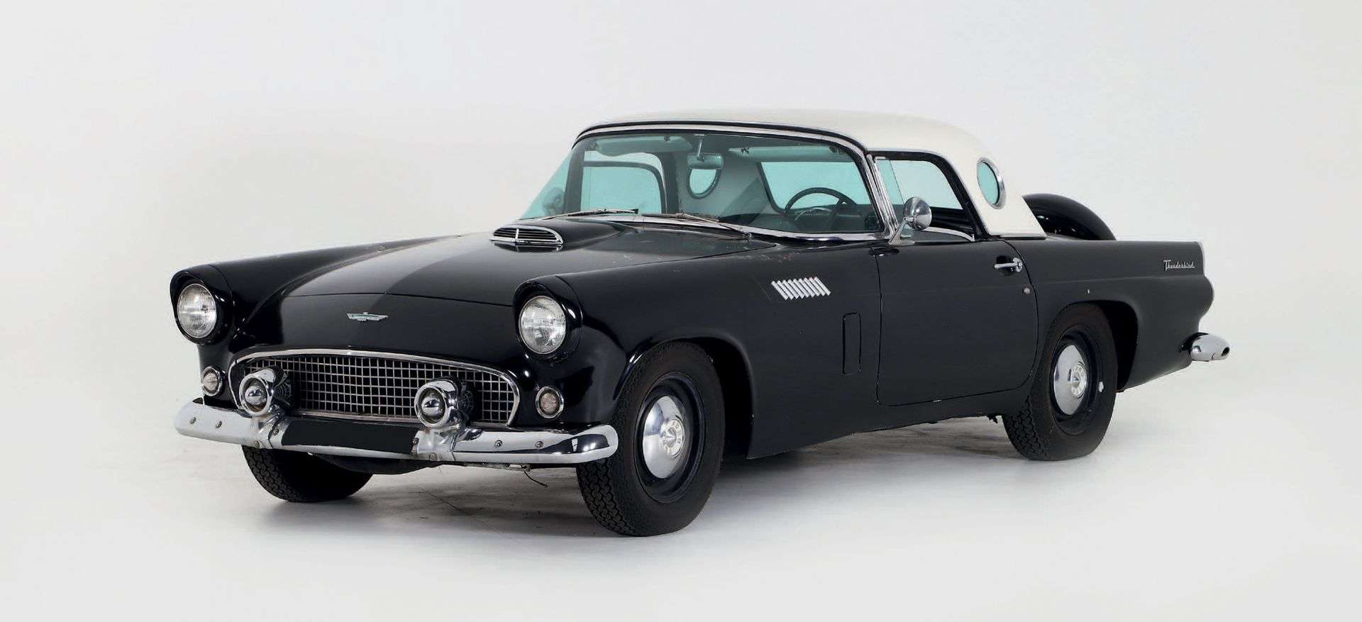 Pour venir concurrencer sur son créneau la Chevrolet Corvette sortie deux ans plus tôt, Ford lance sa nouvelle voiture de sport décapotable en 1955. Son nom, la Thunderbird ! De 1955 à 1957, c’est un modèle cabriolet à deux places équipé d’un V8 puissant. 16 000 exemplaires sont vendus dès la première année, ce qui en fait un succès commercial qui atteindra 53 166 exemplaires durant ses trois premières années de production. Petit à petit la Thunderbird finira par devenir une voiture de luxe sur le créneau de la Cadillac Eldorado. En effet, dès 1958, le bureau d’études de la Ford Motor Company décide de faire de cette voiture une quatre-places à allure sportive. Les ventes sont alors en hausse, Ford surfant sur l’interprétation typiquement américaine de la voiture de sport, avec un moteur V8 monté dans une voiture confortable et spacieuse, dédiée à une clientèle jeune et pleine d’avenir. L’exemplaire que nous avons la chance de présenté est un rare modèle de 1956 qui se distingue du précédent par son pare-chocs arrière avec le Kit Continental plaçant la roue de secours à l’extérieur afin d’augmenter l’espace dans le coffre à bagage. Autre détails qui fit couler beaucoup d’encre à l’époque et qui agite le microcosme des collectionneurs aujourd’hui, le hard top de 1956 est reconnaissable entre tous grâce à son hublot, jamais vu auparavant sur un véhicule et esthétiquement très réussi, il était une option à l’époque. Dans son strict état d’origine, la peinture noire est écaillée par endroit mais mériterait d’être conservée tant elle confère à notre modèle une allure inimitable. Le hard top blanc tranche avec la carrosserie mais recouvre un habitacle en simili noir et blanc. Equipée de la boite de vitesse automatique en option il ne nous a pas été possible de vérifier son bon fonctionnement mais à son achat en 2016, la voiture avait reçu des frais importants et avait rejoint par la route la collection. A redémarrer, il sera nécessaire de contrôler les trains roulants avant de reprendre la route mais cette voiture est présentée largement en dessous de sa cote et offre un fort potentiel pour ceux voulant une américaine iconique dans le plus pure esprit des Rat Cars !