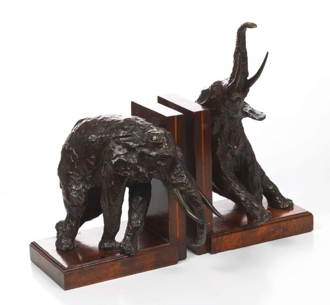 PAIRE DE SERRE-LIVRES En bronze à patine brune figurant deux éléphants, supports en bois. Signés sur une plaque «Ary Bitter