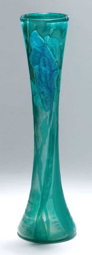 VASE DIABOLO En verre à plusieurs couches, inclusions, marqueterie et décor gravé d'iris | tonalités bleues et vertes. Inscription gravée : «Vers la lumière ...»