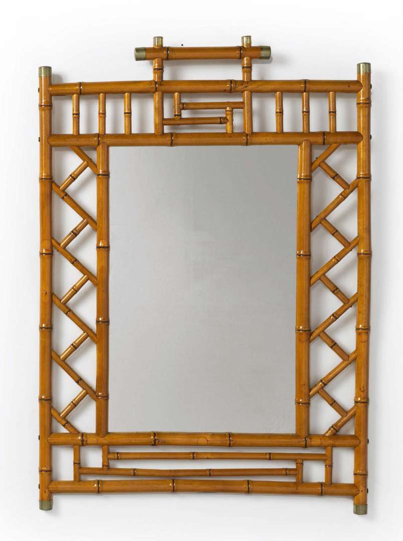MIROIR RECTANGULAIRE Encadrement d'inspiration japonisante en bambou verni, montants supérieurs terminés par des cylindres en laiton.