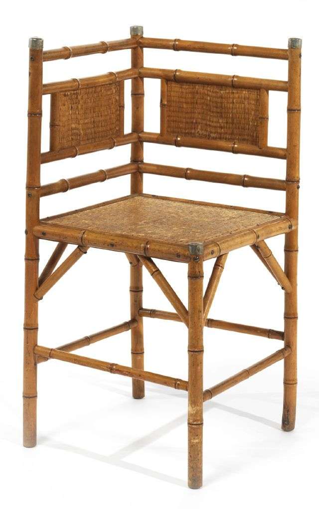 CHAISE D'ANGLE Structure en bambou, assise et dossier gainés de rotin tissé. Les trois montants du dossier et celui de l'assise sont surmontés de cylindres en laiton.