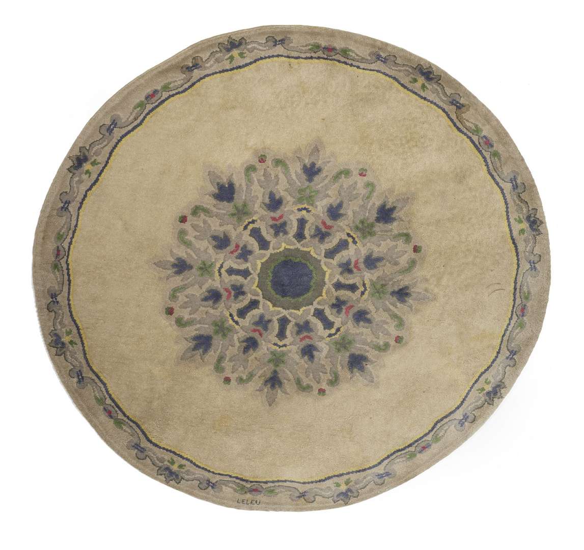 TAPIS CIRCULAIRE En haute laine au point noué, décor central floral rayonnant dans les tons pastel sur fond beige, encadré d'une bordure soulignée d'arabesques à fond gris-bleu.