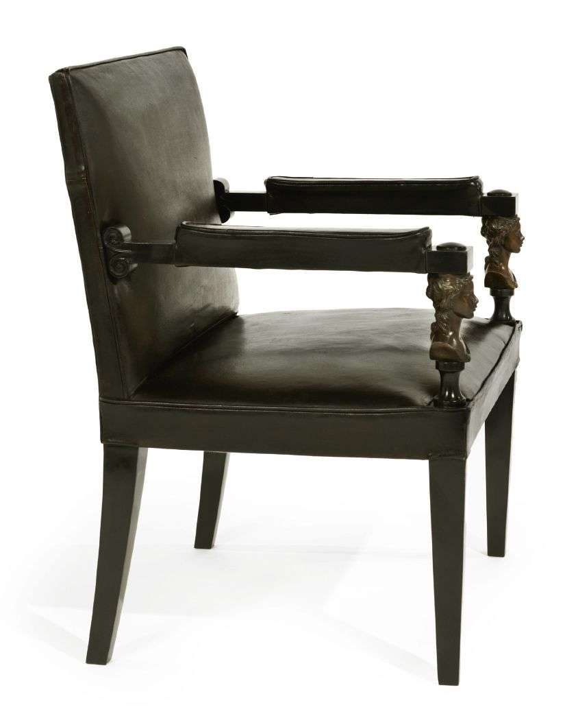 FAUTEUIL EN SYCOMORE TEINTÉ NOIR Supports d'accotoirs en bronze patiné, sculptés en forme de buste féminin par Androusov. Assise, dossier et manchettes d'accotoirs gainés de cuir noir.