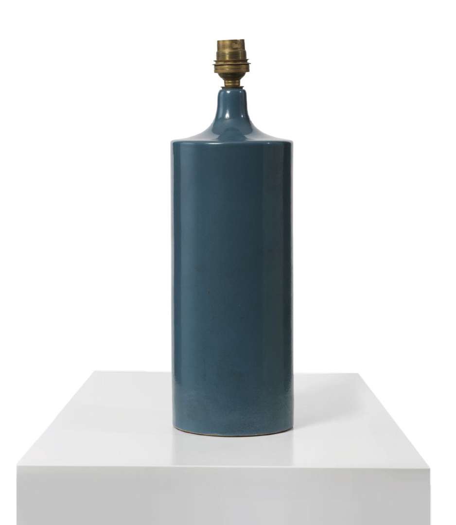 PIED DE LAMPE De forme cylindrique en faïence émaillée bleue.