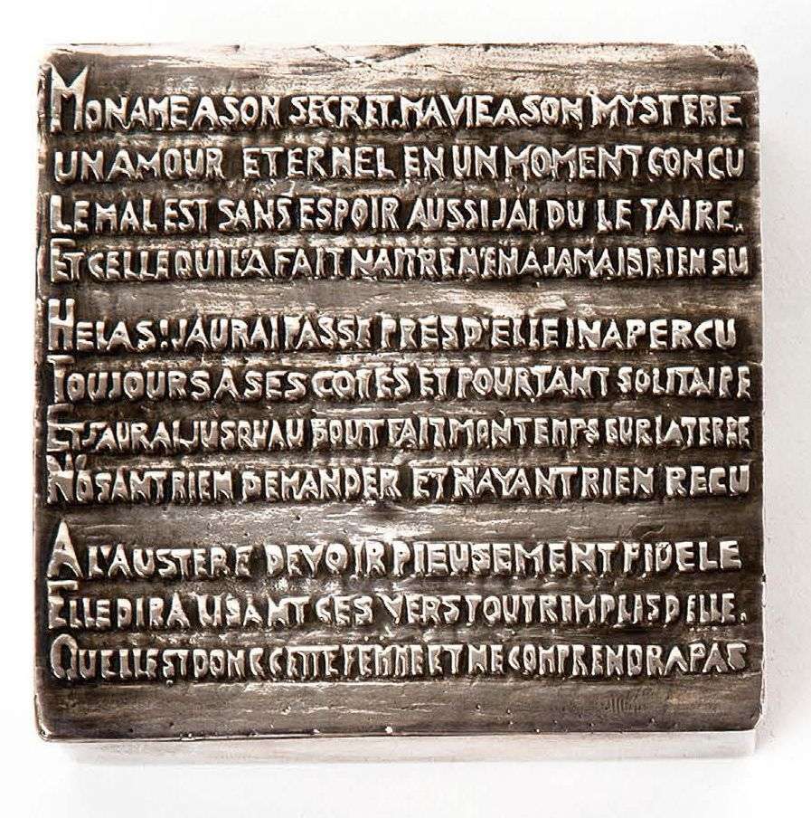 En bronze argenté dont le couvercle est orné d'un sonnet de Félix Arvers | intérieur gainé de liège. Signée «Line Vautrin» au dos. Circa 1945
