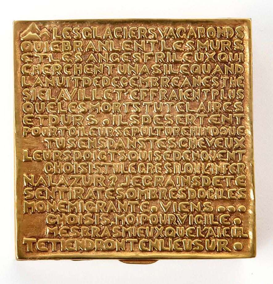 En bronze doré dont le couvercle est orné de vers gravés | intérieur gainé de liège. Signée «Line Vautrin» au dos. Circa 1945