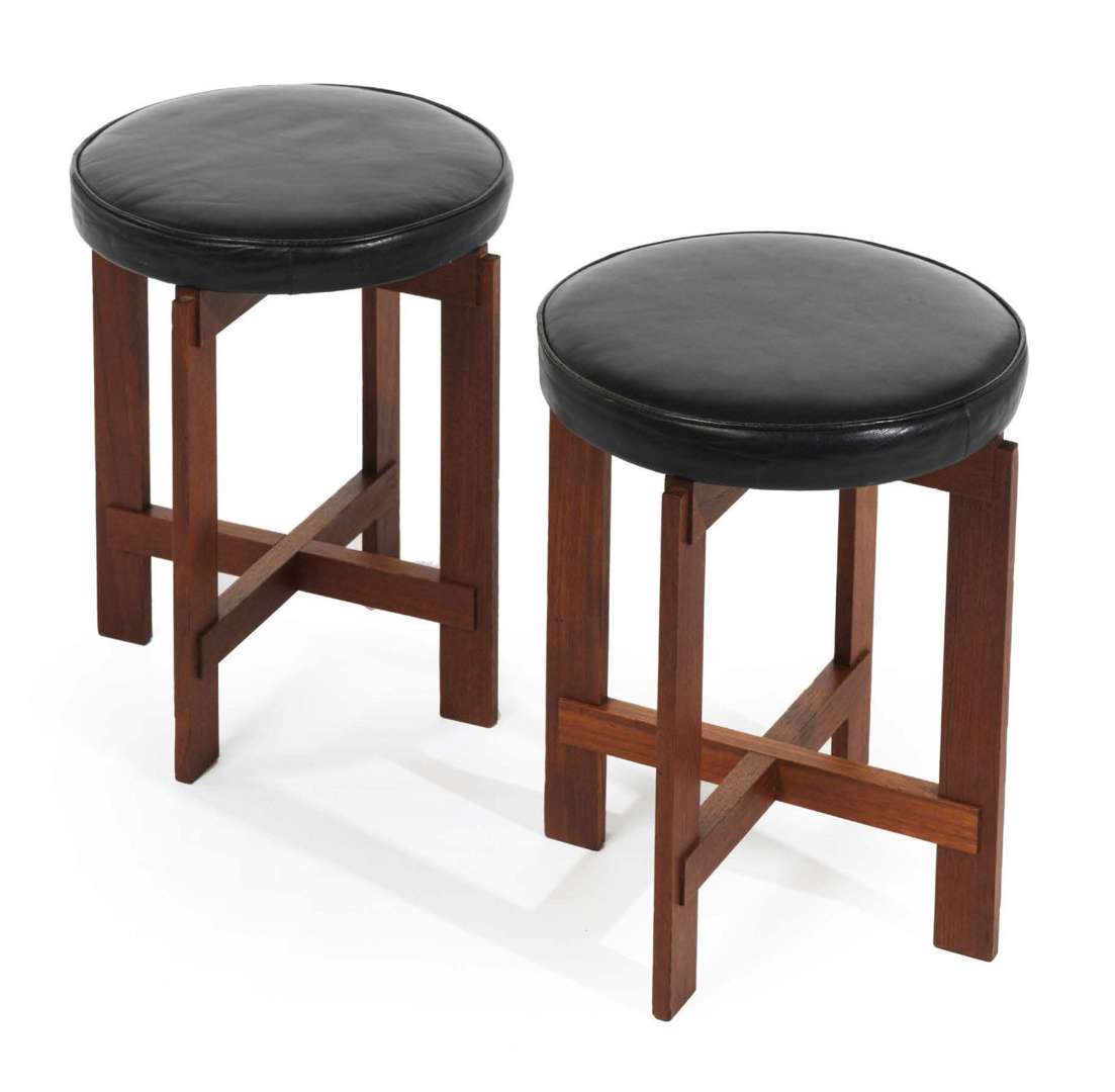 PAIRE DE TABOURETS EN TECK Assise circulaire gainée de cuir noir, reposant sur un piètement cruciforme.