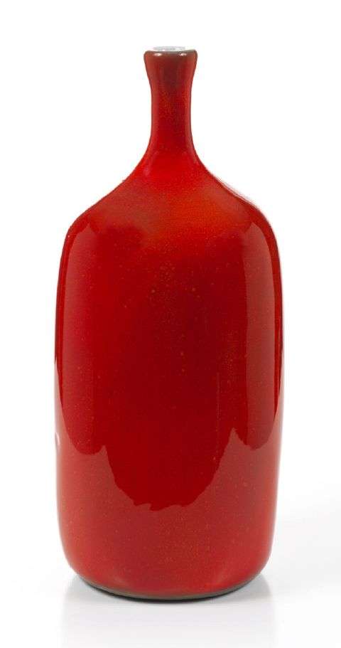 VASE SOLIFLORE En terre grise au manganèse, émail orange flammé, intérieur du col émaillé blanc. Signé au revers de la base.