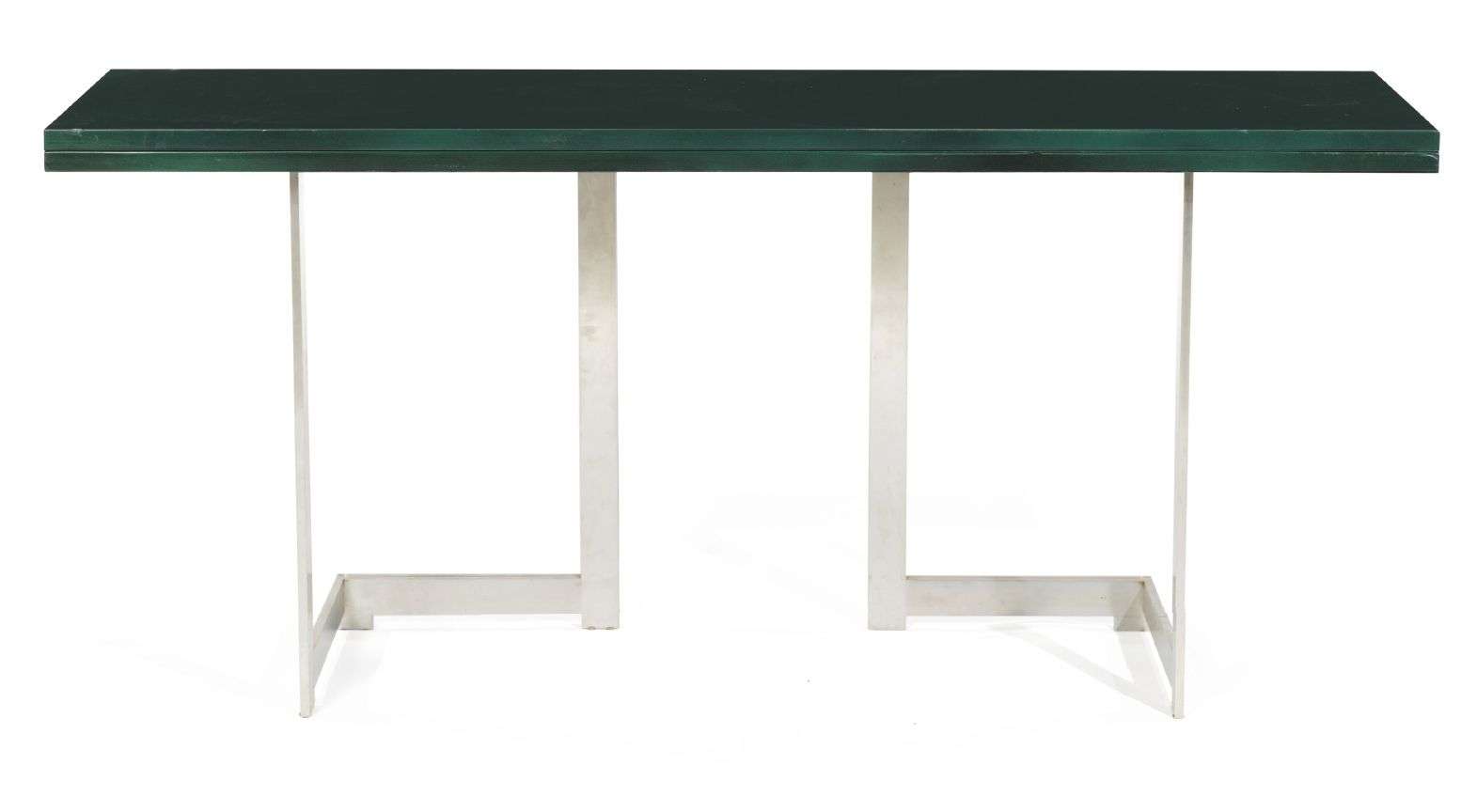 TABLE-CONSOLE Plateau rectangulaire en laque, ouverture portefeuille, reposant sur des pieds-tréteaux en inox.