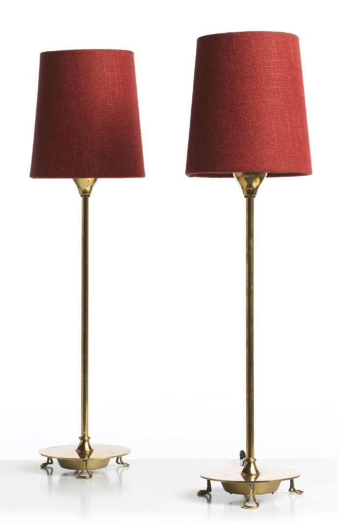 En laiton doré, base circulaire, reposant sur trois petits pieds, abat-jour postérieurs tendus de lin rouge. Editeur
