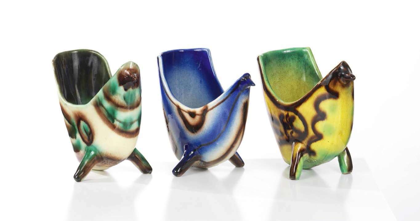En faïence émaillée verte pour l'un, bleue pour un autre et vert-olive pour le dernière, à décor stylisé beige et brun.