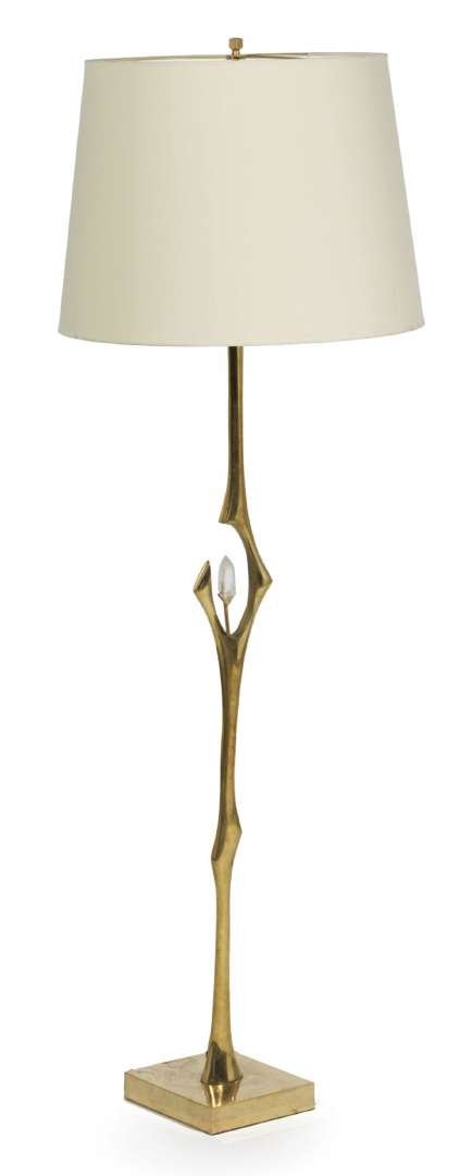 LAMPADAIRE En bronze doré, fût végétal stylisé accueillant un morceau de quartz, base rectangulaire.